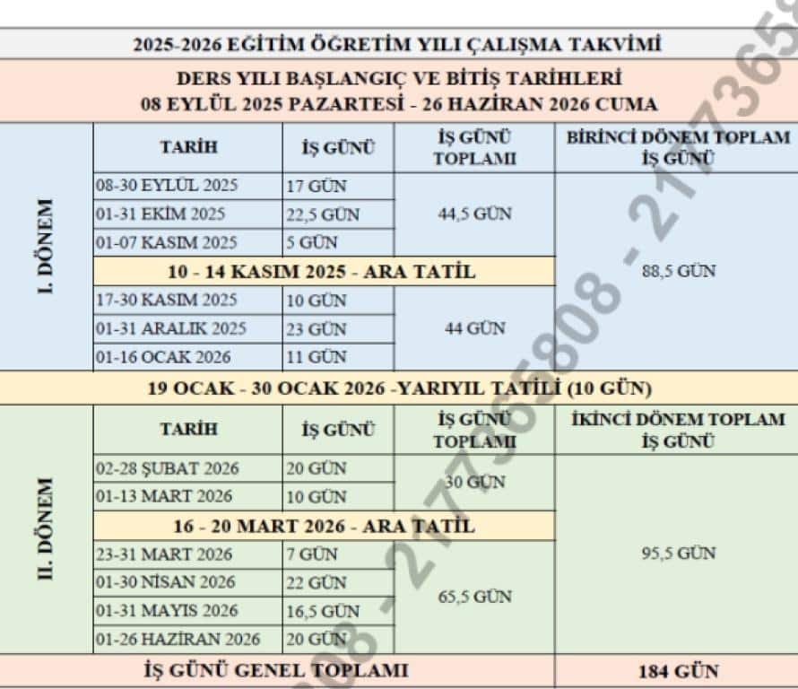 Yeni takvime göre, birinci dönem8 Eylül’de başlayacak ve 16 Ocak 2026’da sona erecek. Öğrenciler, ilk ara tatili 10-14 Kasım 2025tarihleri arasında yapacak. Yarıyıl tatiliise 19 Ocak - 30 Ocak 2026tarihleri arasında uygulanacak.